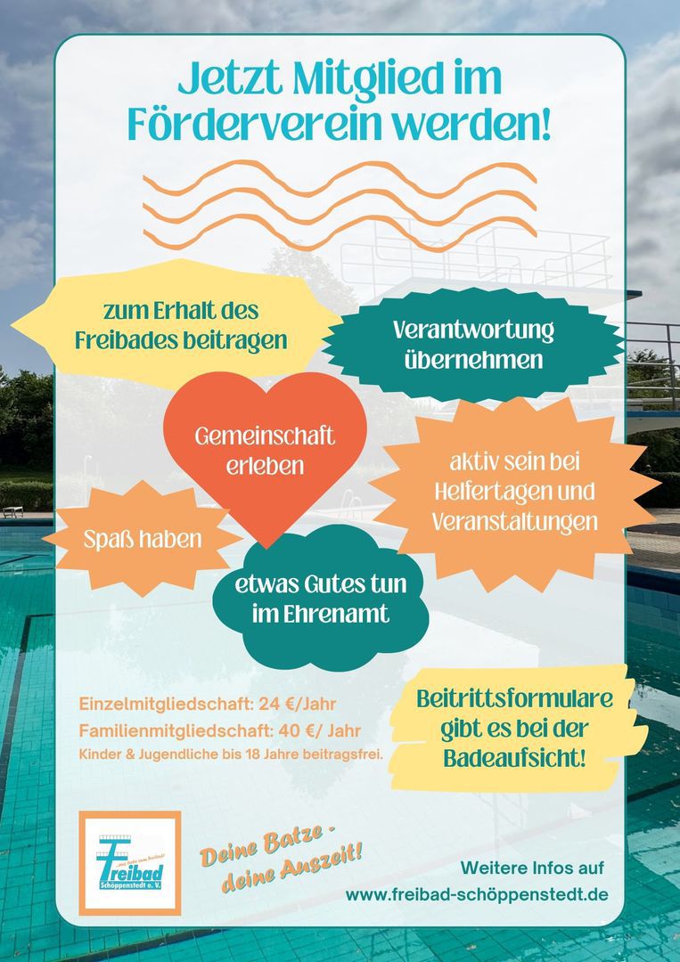 Um das Freibad Schöppenstedt zu erhalten, unterstützt der Förderverein des Freibads die Samtgemeinde Schöppenstedt, bei der die kaufmännische Betriebsleitung liegt - durch ehrenamtliches Engagement, das Anwerben von Sponsoren und Fördergeldern.